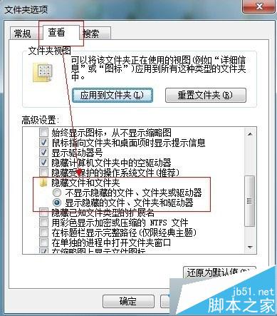 3、点击查看,找到“隐藏文件和文件夹 ”选择“显示隐藏的文件、文件夹和驱动器”点击确定;