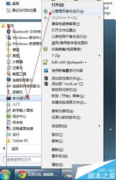2、开始,附件,命令提示符,右键,管理员方式 打开;