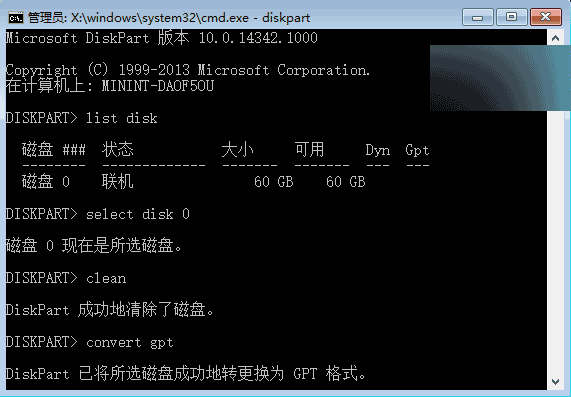 7、执行convert gpt命令将该硬盘转换成GPT分区表,如图5所示