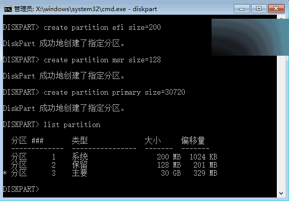 8、创建EFI分区,执行create partition efi size=200(分区大小为200MB),如图6所示
