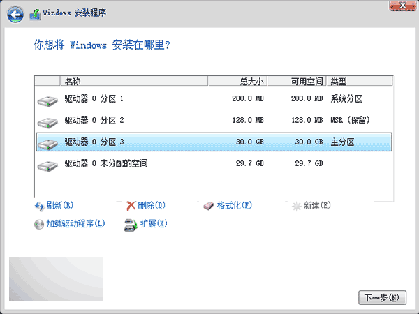 ▲图6:分区过程采用虚拟机模拟,因此主分区大小设定30GB仅作为操作演示,实际操作按照第10步执行