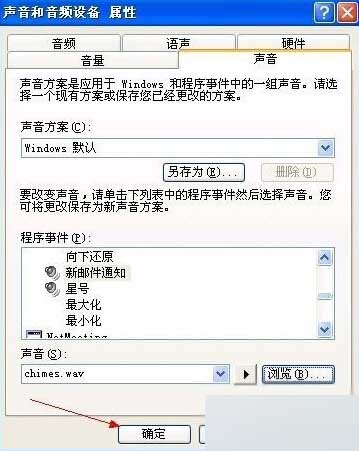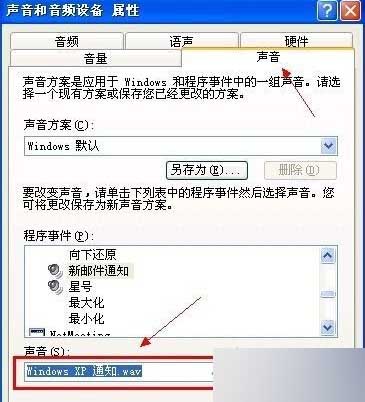 3、打开【声音和音频设备属性】对话框,切换到【声音】选项卡,在【程序事件】框中找到【新邮件通知】并选中,然后单击【声音】向下的三角箭头按钮,在打开的下拉框选择喜欢的声音。