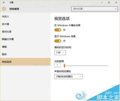 4、另外,如果发现系统的开始菜单操作不流畅,有延迟现象,还可通过系统“设置”窗口,选择“轻松使用→其他选项”,将“在Windows中播放动画”这一视觉选项的开关置于“关”的位置(图2)。