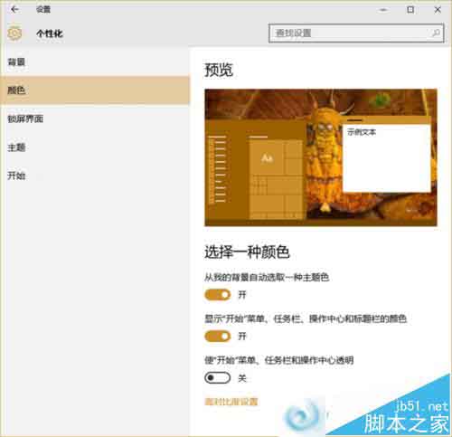 1、Windows 7的毛玻璃效果令人非常难忘,然而在Windows 10初期却去掉了这样的效果,直到最后的新版本,在用户的强烈要求之下才加入了部分组件的半透明效果。现在,在Windows 10系统的某些部件(如开始菜单、任务栏、操作中心),可以实现类似毛玻璃的半透明效果。然而这一效果的有无针对不同人也是“喜忧”参半,有人喜欢有人讨厌。如果要控制这一效果,可通过系统“设置”面板的“个性化”选项,进入个性化窗口选择“颜色”一项,对“使开始菜单、任务栏和操作中心透明”下的开关进行控制(图3)。