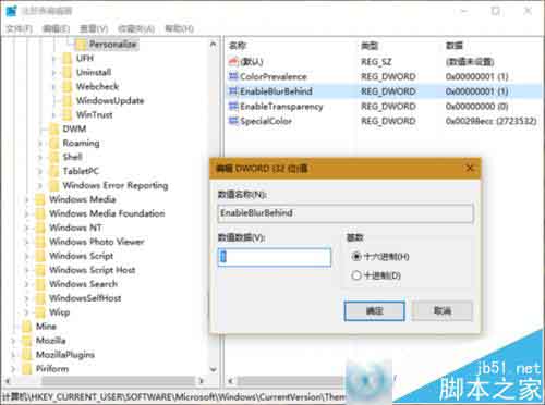 2、如果无法开启毛玻璃效果,可尝试通过修改注册表键值来解决。具体方法:按下Win+R打开“运行”对话框,输入并执行“regedit”命令,进入注册表编辑器。依次展开并定位到“HKEY_CURRENT_USERSOFTWAREMicrosoftWindowsCurrentVersionThemesPersonalize”,双击右窗格中的“EnableBlurBehind”,将该值修改为“1”(图4)。最后重新启动电脑,点击开始菜单就应该能看到期待中的“毛玻璃”效果。