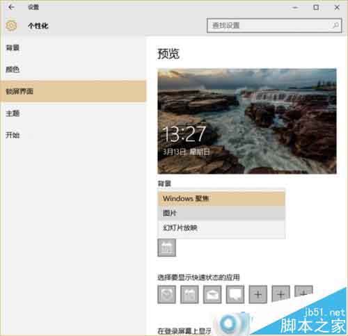 2、单击“开始”按钮,点击“设置”项,在随后开启的“设置”窗口中选择“个性化”,在左侧选择“锁屏界面”,将右侧锁屏方式项选择为“Windows聚焦”之外的两个项目之一(图片方式或幻灯片放映方式)(图5),并关闭“在锁屏界面上获取花絮、提示、技巧等”选项开关,这样Windows的聚焦锁屏广告推送就不会再来烦你了。