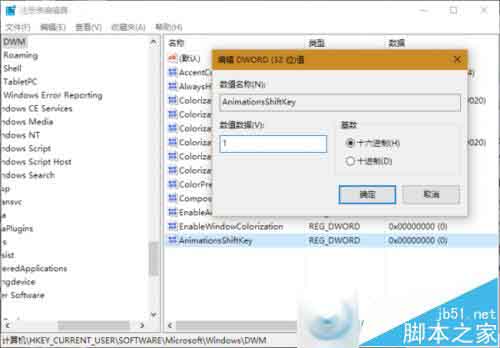 1、在注册表的“HKEY_CURRENT_USERSoftwareMicrosoftWindowsDWM”位置新建名为“AnimationsShiftKey”的DWORD(32位)键,并将其值修改为1(图6),保存后注销并重新登录。之后若在关闭、打开或最大化、最小化窗口的同时按住Shift键,即可看到窗口的慢镜头动作效果。
