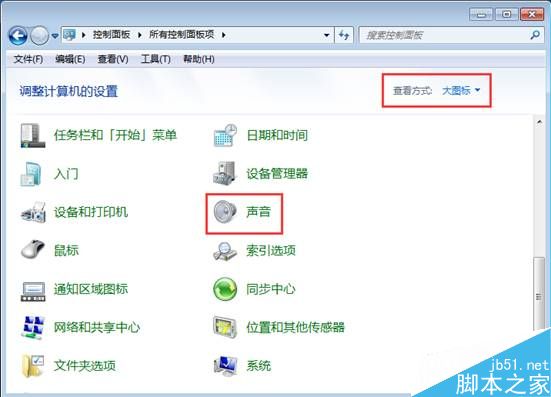 在打开的控制面板中将查看方式选为大图标,然后在列表中找到“声音”,如图所示: