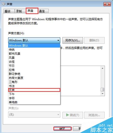 在“声音”窗口中,点击“声音”选项卡,找到“声音方案”,点击右侧小箭头出现下拉菜单,然后选择“无声”,最后选完点击“确定”,如图所示: