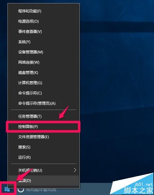 1、右键点击系统桌面左下角【开始】,在开始菜单中点击【控制面板】;