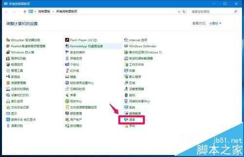 2、在打开的控制面板中找到【语言】,并左键双击:语言;