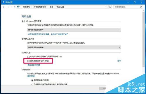 4、在语言的高级设置窗口,我们可见:【使用桌面语言栏】前面的复选框打了勾;