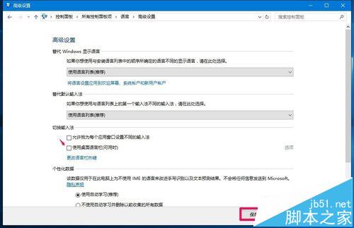 5、我们点击【使用桌面语言栏】前面的复选框去勾,再点击:保存,退出;