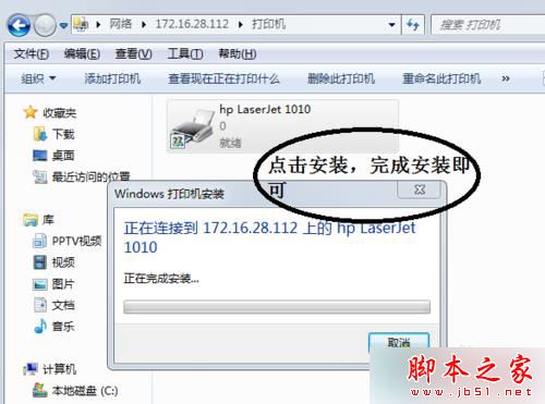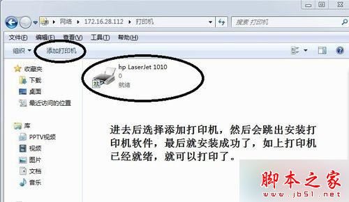8、就是直接在命令栏中输入你需要连接的XP电脑的IP地址(前提他的电脑已经共享出来),进去后选择添加打印机,然后会跳出安装打印机软件,最后就安装成功了,如下图,打印机已经就绪,你可以放心的打印了;