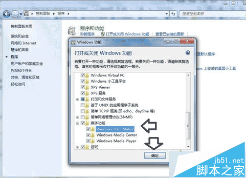 另外,如果从开始菜单中没有找到Windows DVD Maker,需要在打开或关闭Windows功能中勾选Windows DVD Maker。