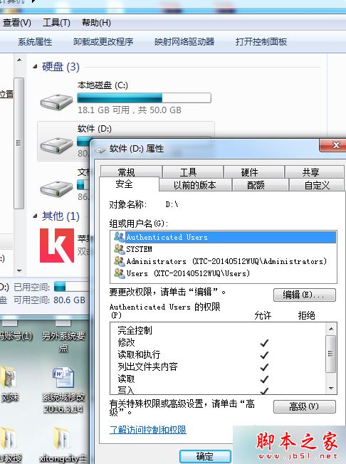 2、右键点击您想打开的文件的磁盘盘符,选择属性,选择安全,更改您当前用户为“完全控制”;
