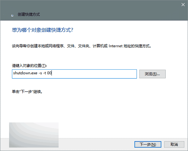 5、在“位置”文本框输入以下命令来关机功能(如上图):
