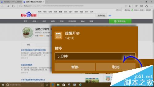 1、当安排的事项时间到了之后,Windows 10 会在屏幕右下角通知区域弹出事件通知窗口,窗口中有标题、时间等信息。按“暂停”将会在后面继续提醒;按“取消”则会停止提醒。
