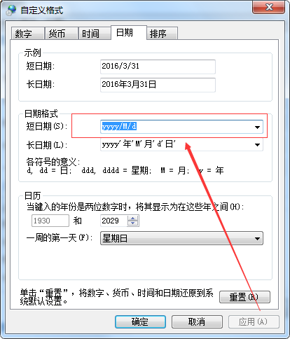 3、然后在短日期中随便选择一个格式“yyyy"年"M"月"d"日"”,然后点击应用问题就解决啦。