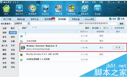 1、如果您已经安装了金山安全套装,请运行套装中的金山卫士,点击顶部中的[软件管理],选择[软件卸载]选项,系统会自动对您当前电脑软件进行分类,您可以选择浏览器分类,金山卫士软件管理工具会将您当前的浏览器全部展现出来;