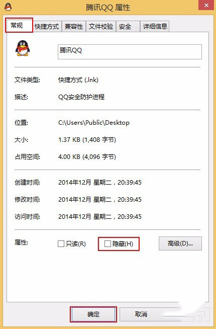 2、在打开的窗口中,切换到常规选项卡,然后勾选下方的“隐藏”,随后点击确定按钮,如下图所示: