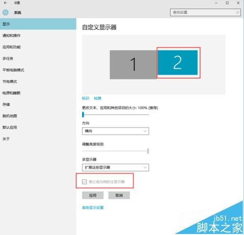 6、将显示器2设置为主显示器,点击显示器2,勾选使之成为主显示器: