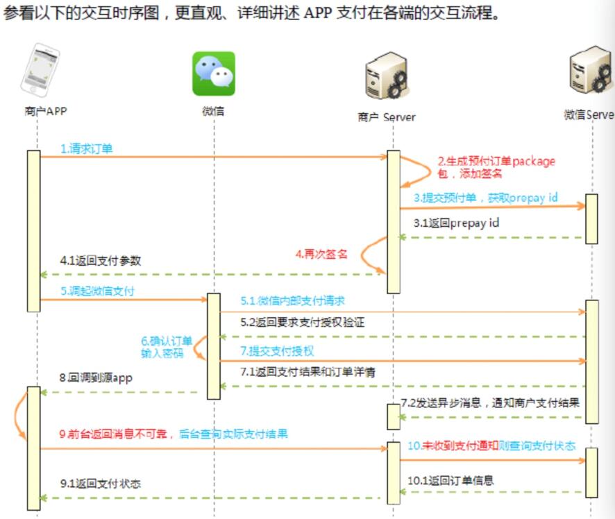 <uses-permission android:name="android.permission.INTERNET"/> <uses-permission android:name="android.permission.ACCESS_NETWORK_STATE"/><uses-permission android:name="android.permission.ACCESS_WIFI_STATE"/><uses-permission android:name="android.permission.READ_PHONE_STATE"/> <uses-permission android:name="android.permission.WRITE_EXTERNAL_STORAGE"/> <!-- 启动主页面 --><activityandroid:name=".ui.activity.MainActivity"android:label="@string/app_name" ><intent-filter><action android:name="android.intent.action.MAIN" /><category android:name="android.intent.category.LAUNCHER" /></intent-filter><intent-filter><action android:name="android.intent.action.VIEW" /><category android:name="android.intent.category.DEFAULT" /><data android:scheme="wx487898a262d23df3" /></intent-filter></activity><activityandroid:name=".wxapi.WXPayEntryActivity"android:exported="true"android:label="@string/title_activity_wxpayentry"android:launchMode="singleTop" /><receiverandroid:name=".wxpay.AppRegister"android:permission="com.tencent.mm.plugin.permission.SEND" ><intent-filter><action android:name="com.tencent.mm.plugin.openapi.Intent.ACTION_REFRESH_WXAPP" /></intent-filter></receiver>/** * 首先调用接口,要把一些基本信息作为参数传给服务器 * 比如:金额fee,用户id,标题title等 * 调用成功之后会返回微信所需要的参数,如: * appid,noncestr,package,partnerid,prepayid, * timestamp,sign * 微信支付 */StringBuffer sb = new StringBuffer();WeixinPay wpay;private AlertDialog mDialog;private AlertDialog.Builder builder;public void weixinPay() {// 通过WXAPIFactory工厂,获取IWXAPI的实例api = WXAPIFactory.createWXAPI(this, Constants.APP_ID);// 将该app注册到微信api.registerApp(Constants.APP_ID);// 调用接口Params p = new Params();p.put("fee",fee);p.put("spbill_create_ip", NetWorkUtils.getLocalIpAddress(this));String value = "商品标题 " + title;try {String title = new String(value.getBytes("UTF-8"));p.put("body", title);} catch (UnsupportedEncodingException e) {e.printStackTrace();}p.put("userId", O.getUser().getId());p.post(C.URL.WEIXIN_PAY, new ReHandler() {@Overridepublic void onSuccess(NetEntity entity) {wpay = entity.toObj(WeixinPay.class);PayReq req = new PayReq();req.appId = wpay.getAppid();// 微信appIdreq.packageValue = wpay.getPackageValue();// 包req.extData = "app data"; // optionalreq.timeStamp = wpay.getTimeStamp();// 时间戳req.partnerId = wpay.getPartnerId();// 商户号"req.prepayId = wpay.getPrepayId();// 预支付订单号req.nonceStr = wpay.getNonceStr();// 随机字符串req.sign = wpay.getSign();// 后台返回的签名// 本地再次签名List<NameValuePair> signParams = new LinkedList<NameValuePair>();signParams.add(new BasicNameValuePair("appid", req.appId));signParams.add(new BasicNameValuePair("noncestr", req.nonceStr));signParams.add(new BasicNameValuePair("package",req.packageValue));signParams.add(new BasicNameValuePair("partnerid",req.partnerId));signParams.add(new BasicNameValuePair("prepayid", req.prepayId));signParams.add(new BasicNameValuePair("timestamp",req.timeStamp));req.sign = genAppSign(signParams);// 调微信支付if(api.isWXAppInstalled()&&api.isWXAppSupportAPI()){api.sendReq(req);}else{builder = new AlertDialog.Builder(WXPayEntryActivity.this);builder.setNeutralButton("关闭",new DialogInterface.OnClickListener() {@Overridepublic void onClick(DialogInterface dialog, int which) {mDialog.dismiss();}}).setTitle("友情提醒").setMessage("请安装微信客户端");mDialog = builder.create();mDialog.show();}}@Overridepublic void onStart() {}@Overridepublic void onFailure(String message) {}});}private String genAppSign(List<NameValuePair> params) {StringBuilder sb = new StringBuilder();for (int i = 0; i < params.size(); i++) {sb.append(params.get(i).getName());sb.append("=");sb.append(params.get(i).getValue());sb.append("&");}sb.append("key=");sb.append(Constants.API_KEY);this.sb.append("sign str