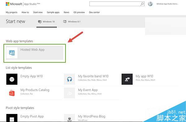 点此进入Windows App Studio创建工程页面,你需要使用微软账户登录。在该页面你会看到Hosted Web App选项,如下图所示: