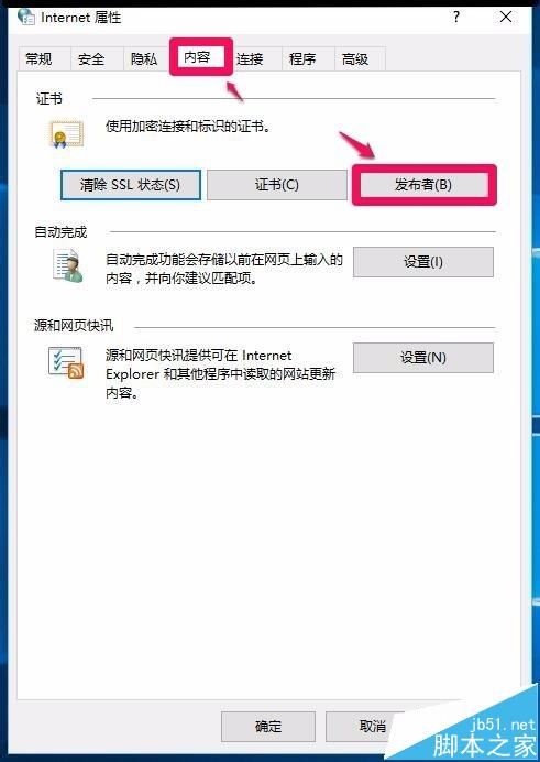 2、在打开的Internet 属性窗口,点击“内容”,在内容标签下点击证书项的发布者(B);