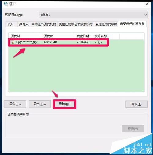 4、在“未受信任的发布者”标签下,点击:430********.00...,再点击:删除 - 关闭;
