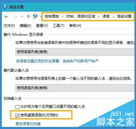 1、打开控制面板,在语言--高级设置中找到并勾选“使用桌面语言栏”,之后确定退出即可;