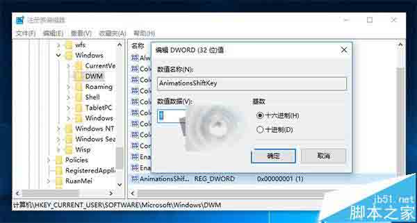 4、双击新建值AnimationsShiftKey,将其值修改为1,保存。