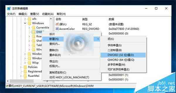 HKEY_CURRENT_USERSoftwareMicrosoftWindowsDWM3、在右侧新建名为