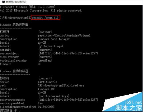 2、在打开的命令提示符中输入bcdedit /enum all回车,就可以看到很多内存块被标记为bad。如图示: