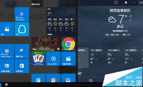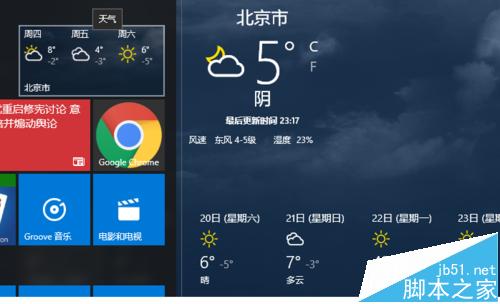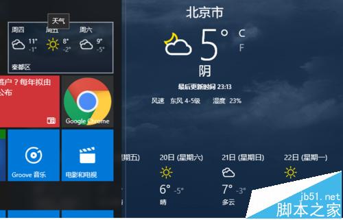 2、一般更改后要显示地区后,开始菜单动态磁贴中天气不会及时更新,只需要取消删除动态磁贴,并关闭天气软件后,重新打开天气后,再次增加开始菜单动态磁贴即可更新天气。