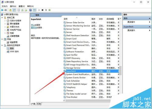3、然后依次点击服务菜单项,在右侧打开的服务列表中,找到superfetch一项