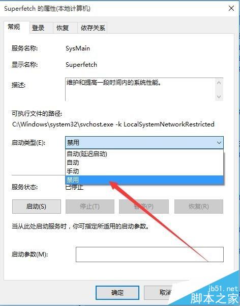 5、为防止下次开机的时候,superfetch服务自动启动,点击“启动类型”下拉菜单,然后在弹出的菜单中选择“禁用”菜单项