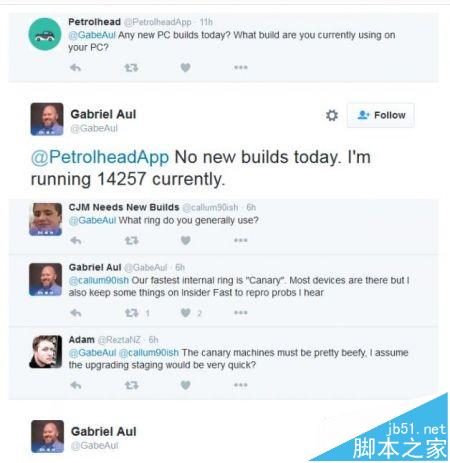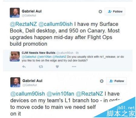关于设备,Gabriel Aul表示他使用的是surface Book、Lumia950以及戴尔台式机,均在“Canary(金丝雀)”通道。
