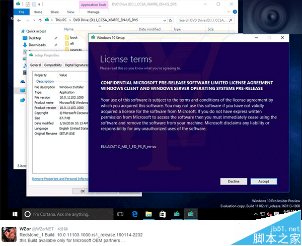 细心的朋友可能发现截图右下角的水印还是11102版,因为WZor刚拿到这个版本,还没来得及完成安装,因此截图只提供了初始的安装界面和setup程序的版本信息。从他给出的版本号来看,这个11103编译于1月14日。