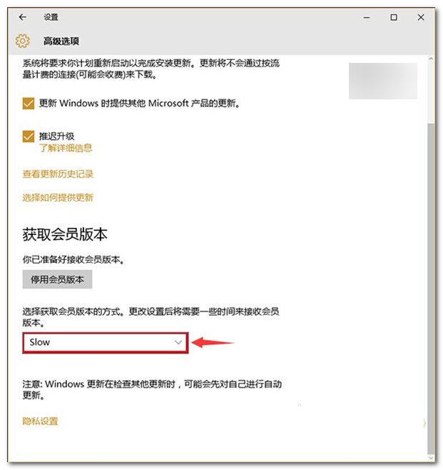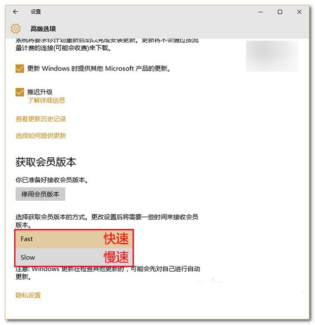 4、点击下拉菜单选择Win10 Insider会员版本更新通道。一般来说,“快速版”推送较频繁,容易更快见到Win10新功能;而“慢速版”推送频率比较低,但更稳定,适合对于系统稳定性要求较高的用户。这两个版本只有上述区别,与“激活”等条件无关,大可放心使用。