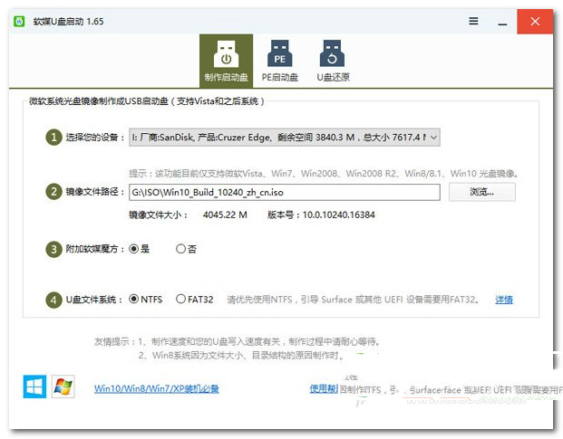 - 使用软媒魔方的“U盘启动”工具(点击下载)制作Win10安装U盘,然后用U盘启动进行安装