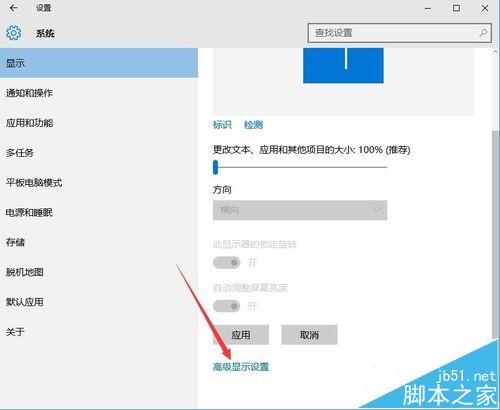3、在系统设置窗口右侧窗口中向下拉滑动条,找到“高级显示设置”快捷链接,点击该链接后进入设置窗口