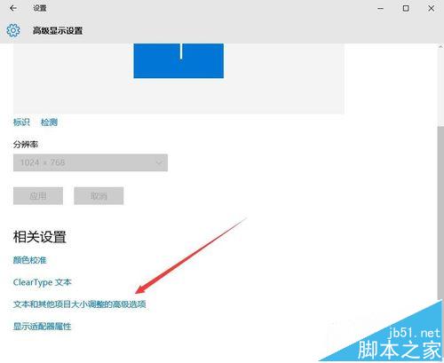 4、在打开的高级显示设置窗口中,点击“文本和其他项目大小调整的高级选项”一项,打开文本大小设置窗口