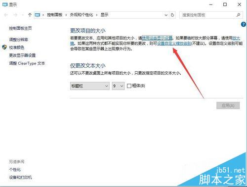 5、在打开的新窗口中,点击“更改项目的大小”一项中的“设置自定义缩放级别”链接
