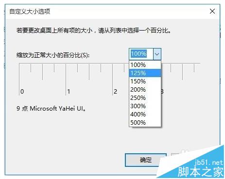 6、在打开的“自定义大小选项”窗口中,选择“缩放为正常大小的百分比”一项为100%,最后点击确定按钮