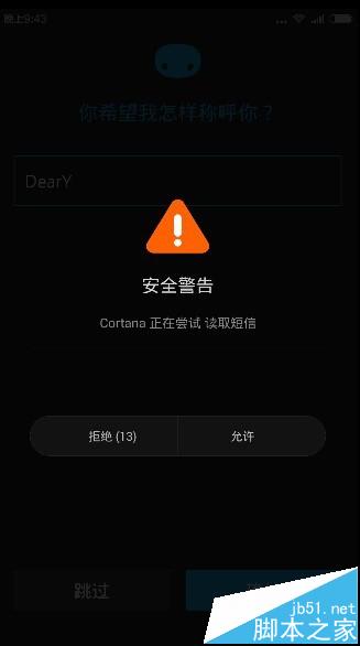 2、同时允许手机版Cortana“读取手机联系人”和“手机短信”权限。当显示如图所示的“安全警告”窗口时,点击“允许”按钮。