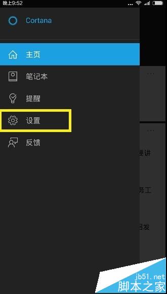 3、在手机版Cortana主界面中,点击左上角的“菜单”按钮,从其扩展菜单中点击“设置”项进入。