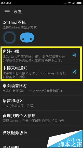 4、从打开的“Cortana设置”界面中,勾选“未接来电通知”项,这样手机版Cortana才能将手机未接来电上传到云端。