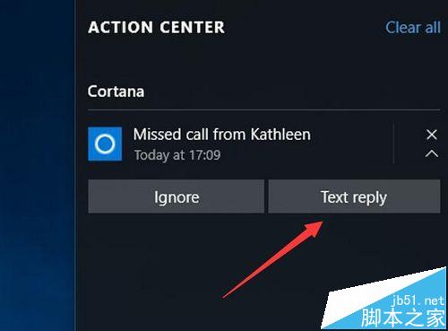 5、经过以上设置之后,当手机存在未接来电时,在Win10PC端将弹出如图所示的Cortana未接来电提醒界面,在此可以选择“忽略”或“发送文本短信”。