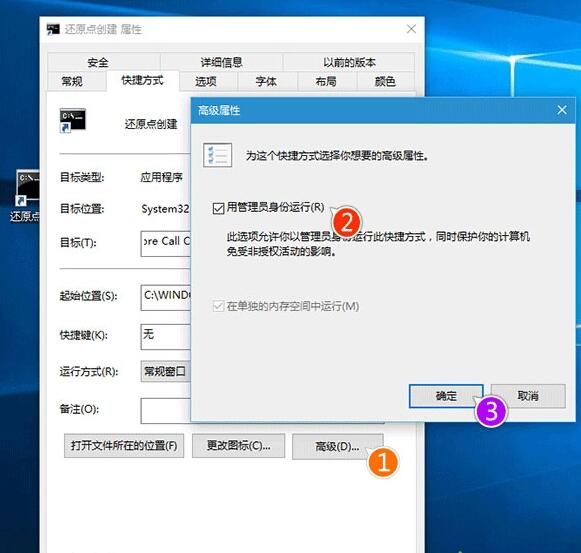 5、在“快捷方式”选项卡中点击“高级...”,勾选“用管理员身份运行”,点击“确定”按钮完成(如上图)。